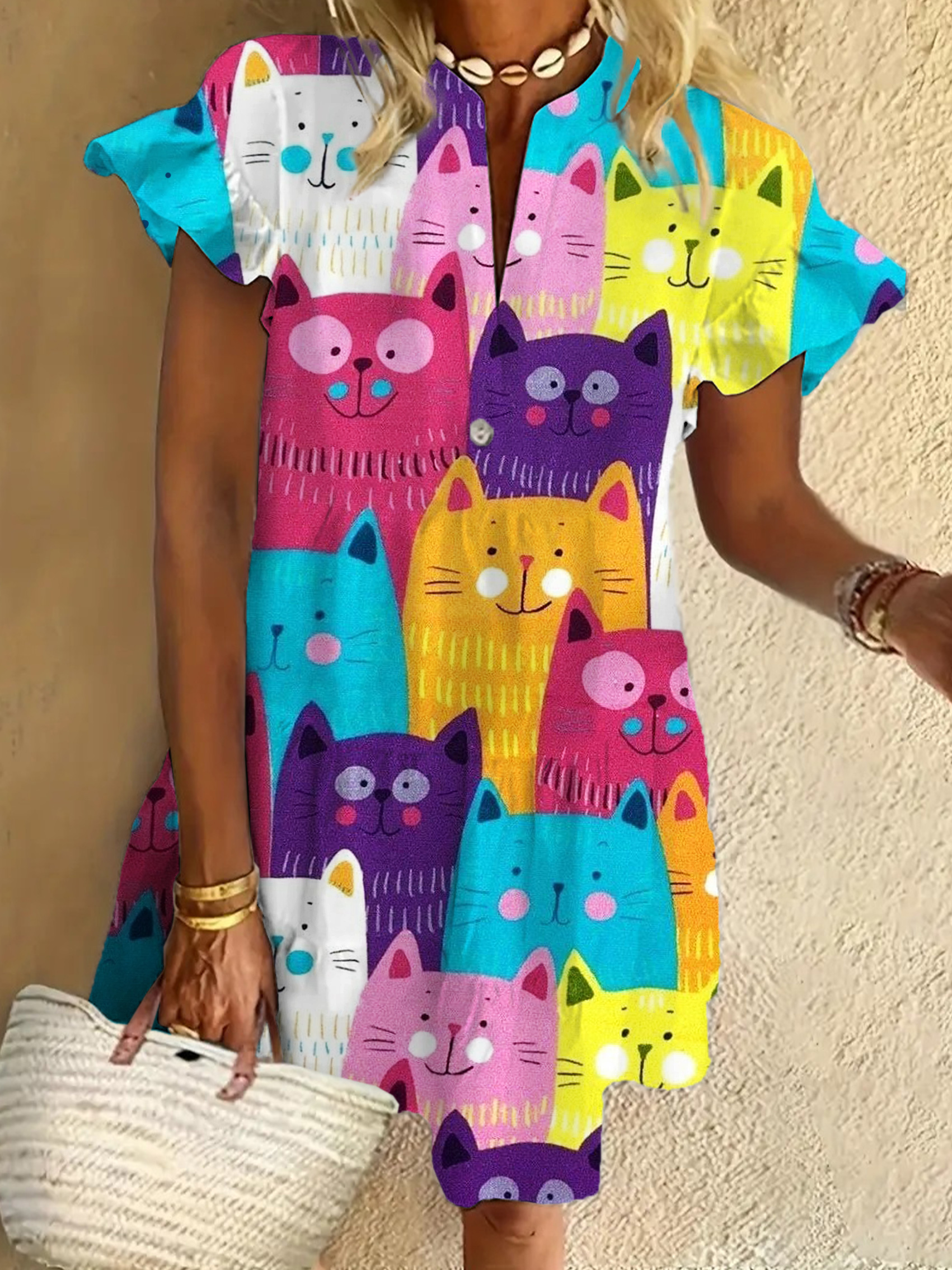 Colorful Cats Ruffled Short-sleeved V-neck Buttoned Dress Vacation Beach Dress