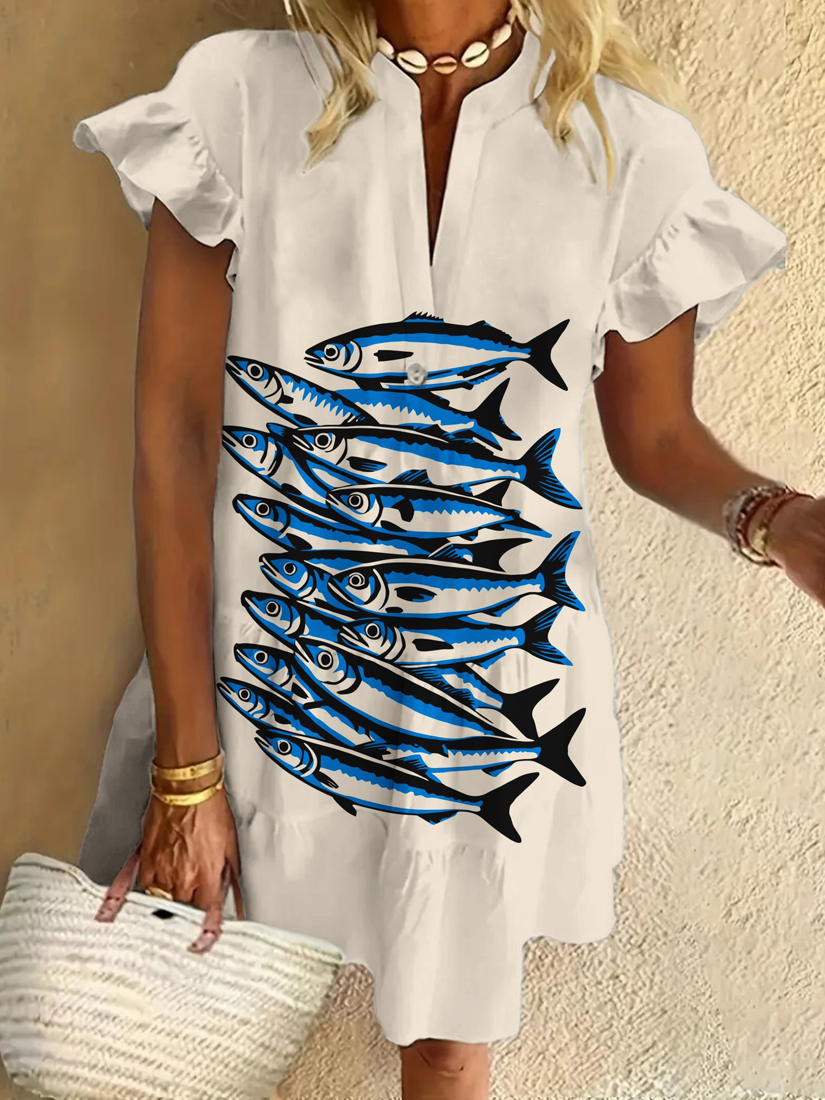 Fish Print Ruffled Short-sleeved V-neck Buttoned Dress Vacation Beach Dress