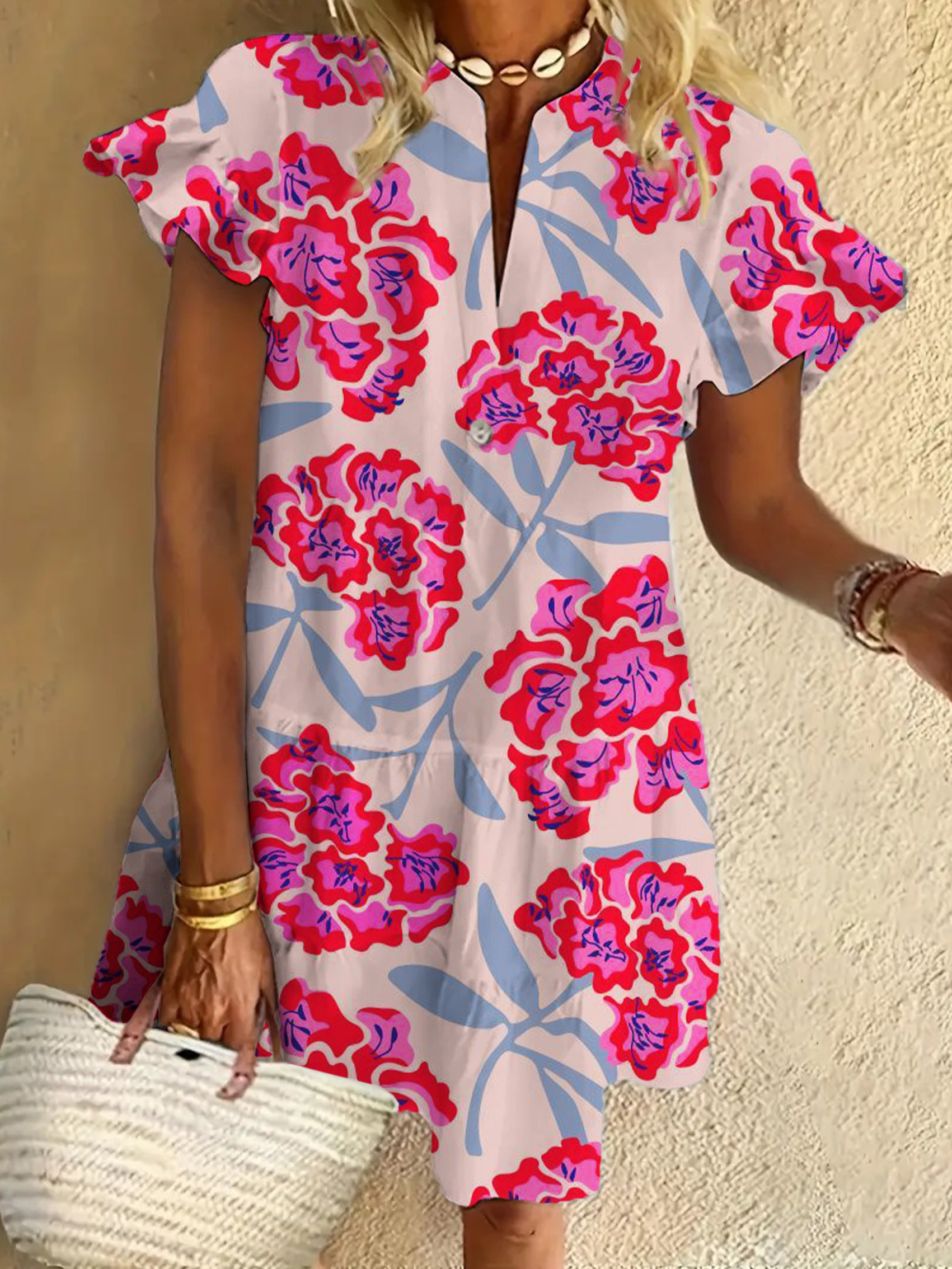 Floral Art Print Ruffled Short-sleeved V-neck Buttoned Dress Vacation Beach Dress