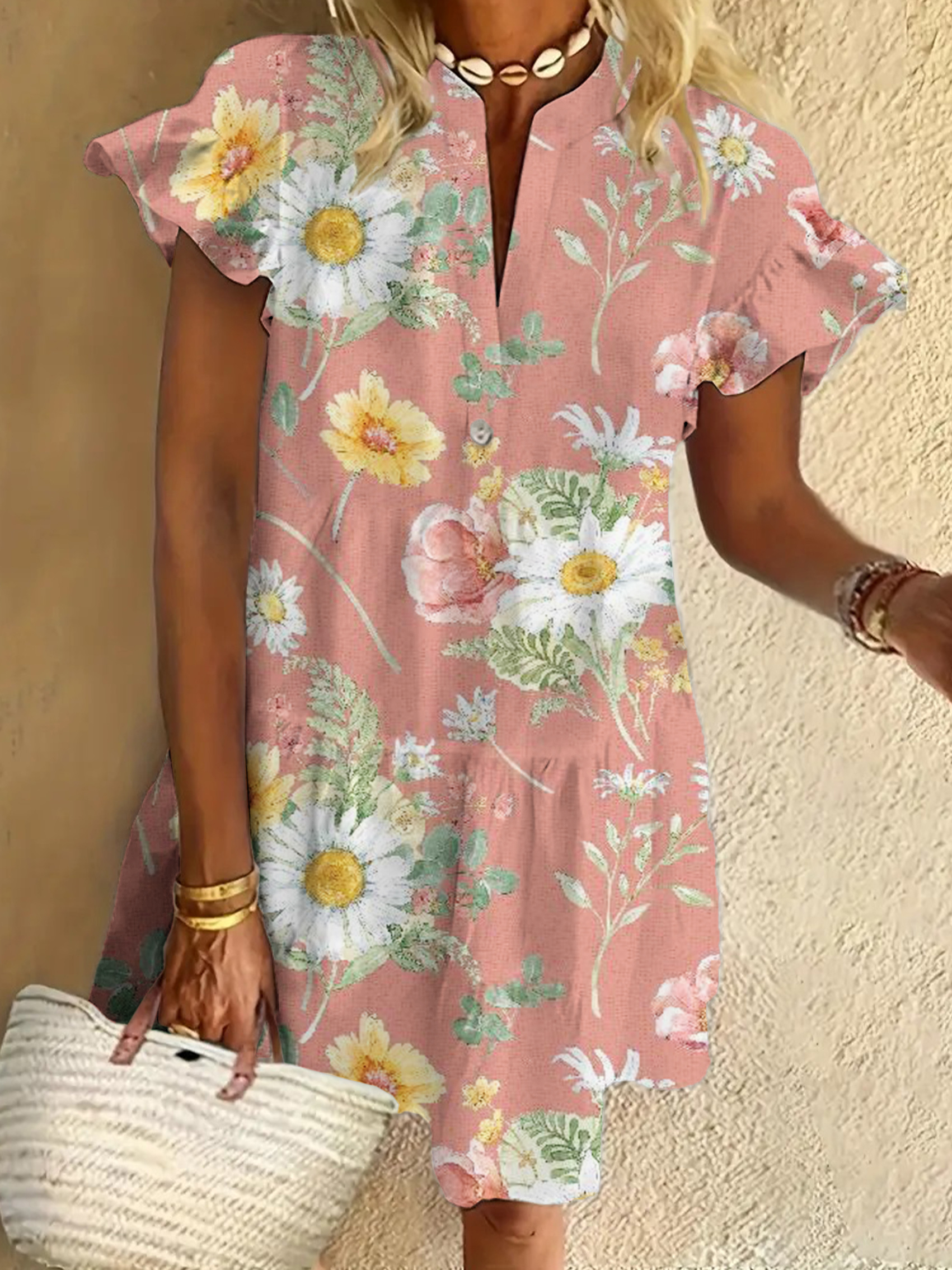 Floral Print Ruffled Short-sleeved V-neck Buttoned Dress Vacation Beach Dress