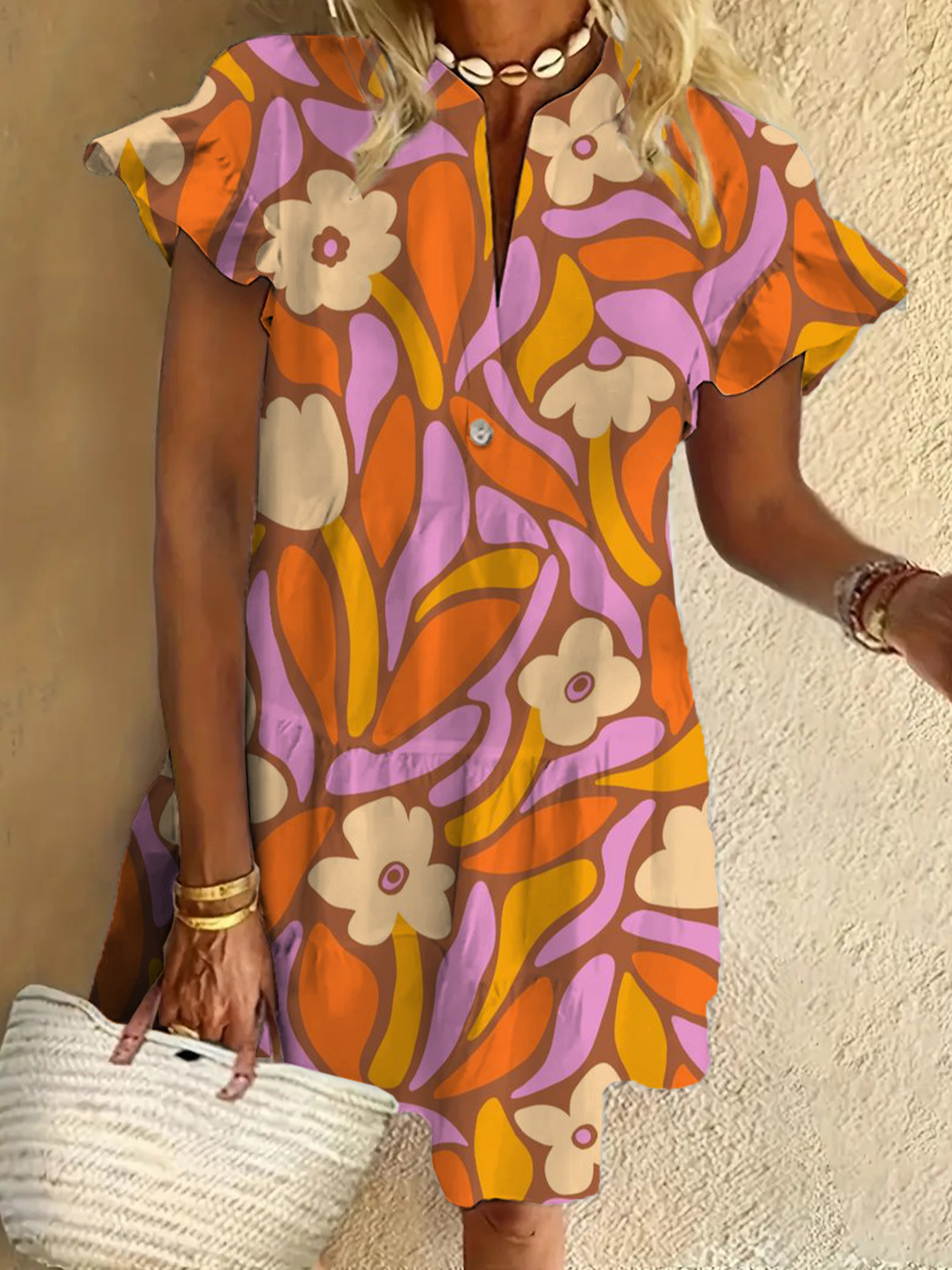 Floral Print Ruffled Short-sleeved V-neck Buttoned Dress Vacation Beach Dress