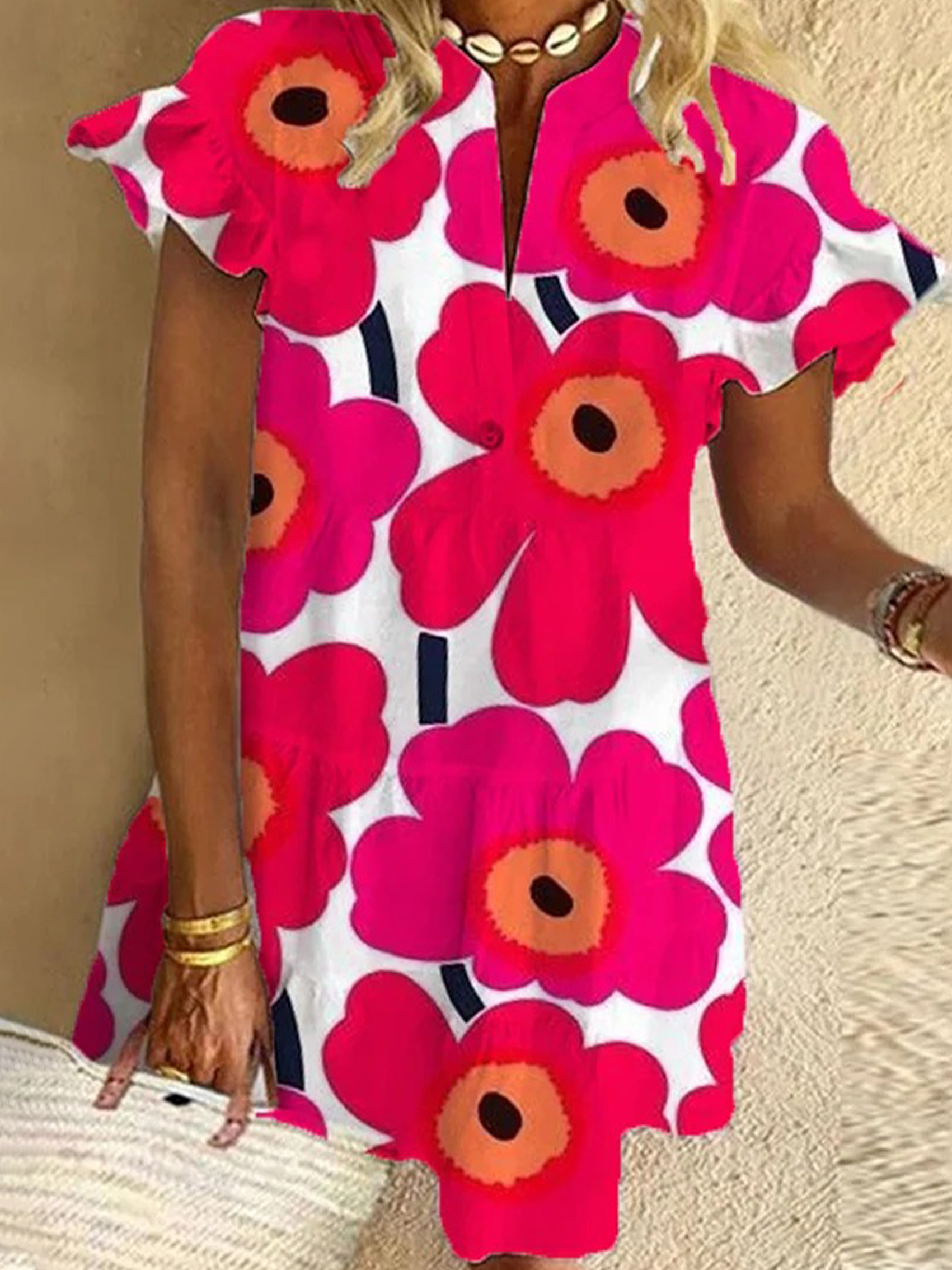 Pink Flower Ruffled Short-sleeved V-neck Buttoned Dress Vacation Beach Dress