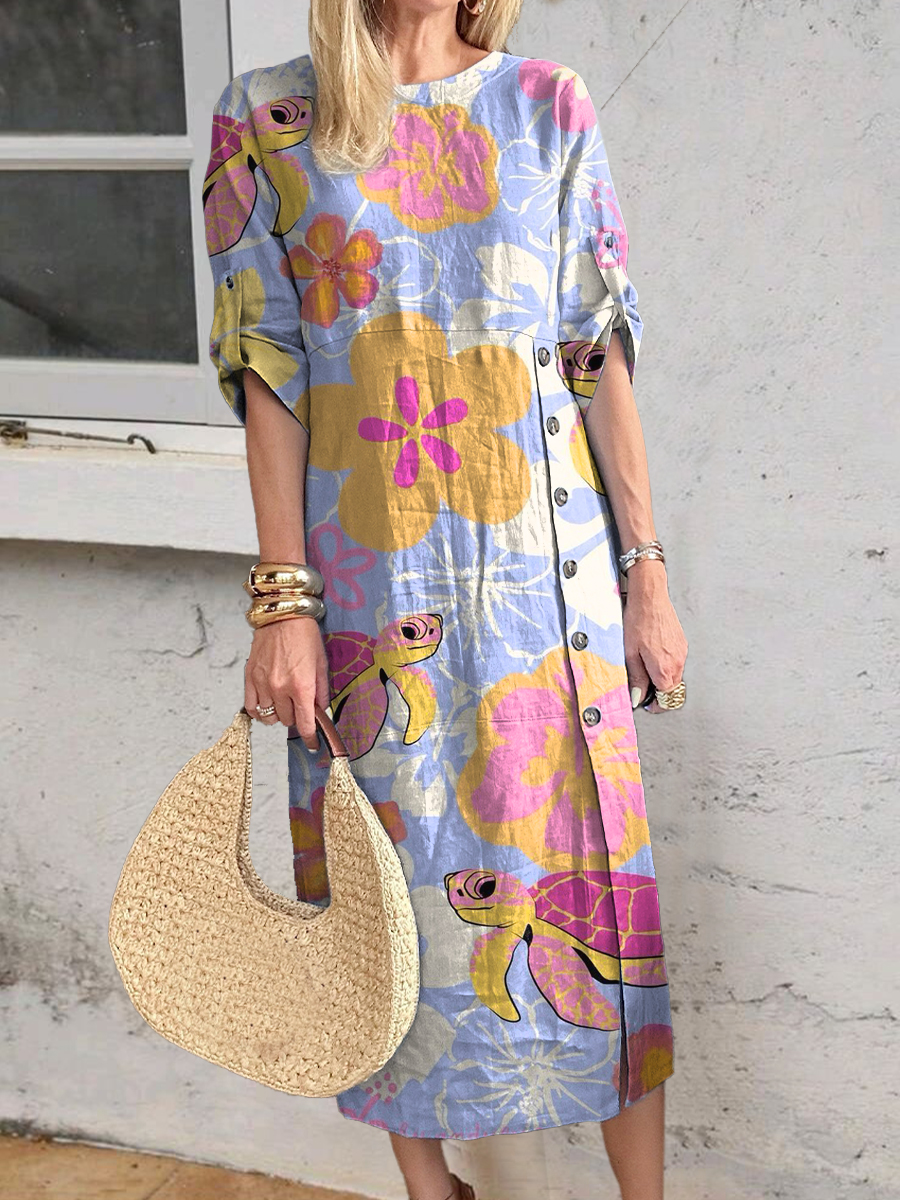 Turtle Illustration Women's Print Button Pocket Cotton Dress