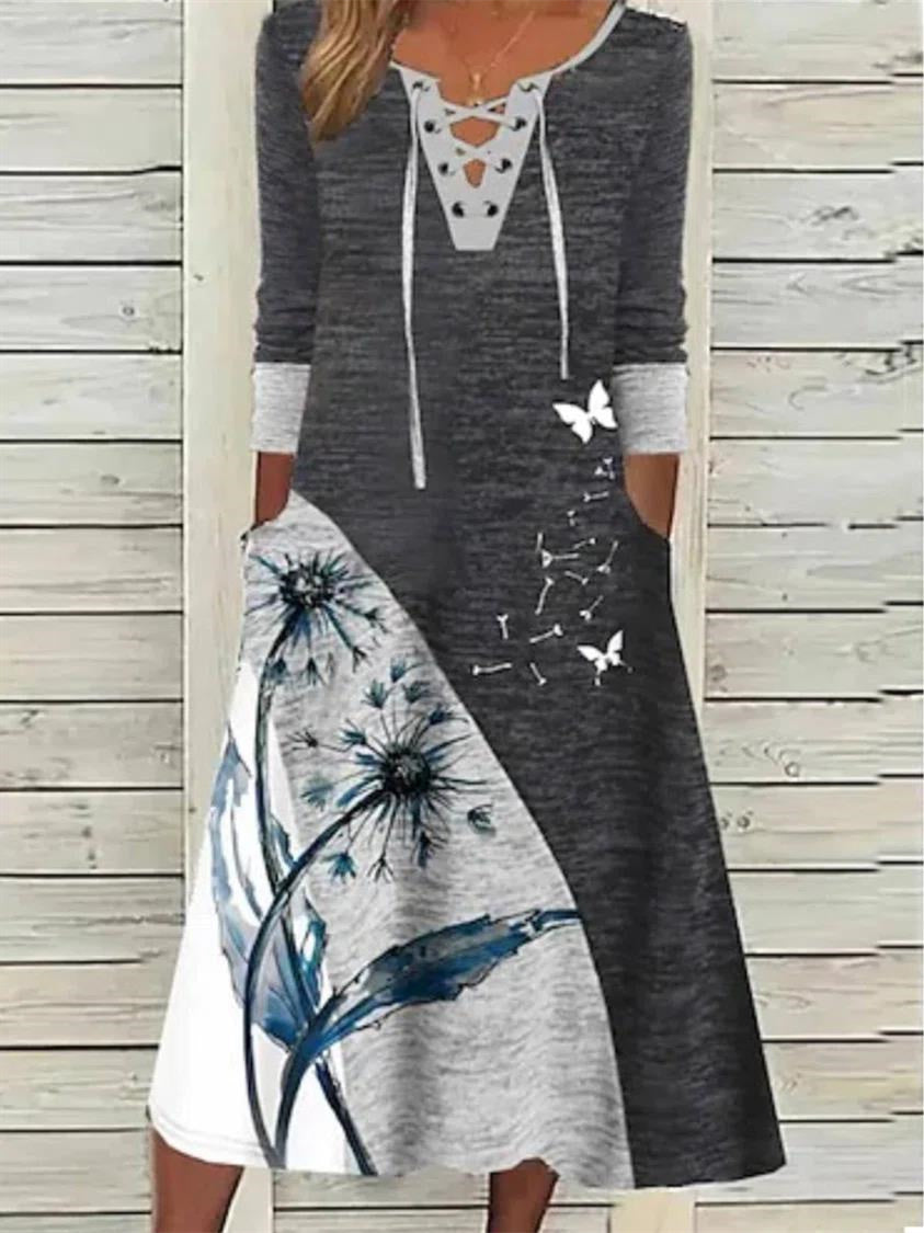Women Long Sleeve V-neck Graphic Floral Printed Midi Dress