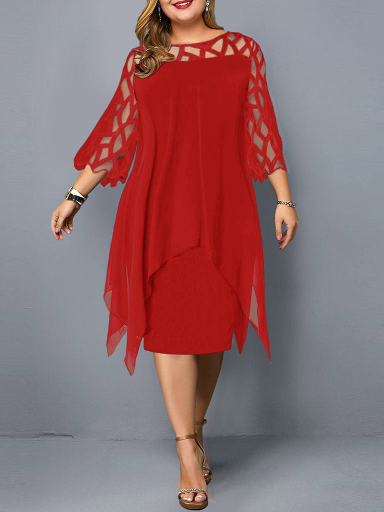 Women's Lace Stitching Hollow 3/4 Sleeve Irregular Hem Chiffon Dress Formal Dress