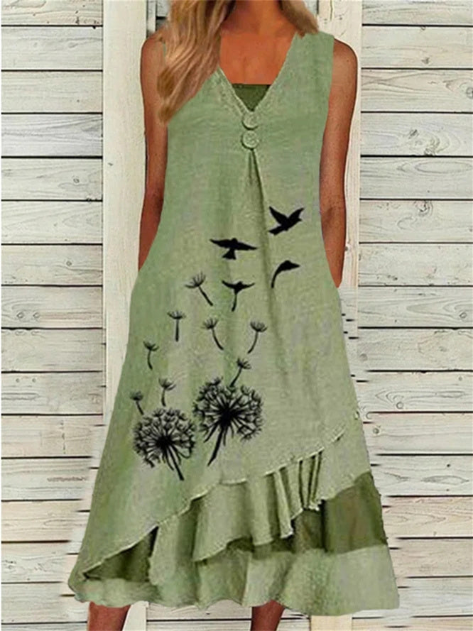 Women's Green V-Neck Short Sleeve Printed Maxi Dress