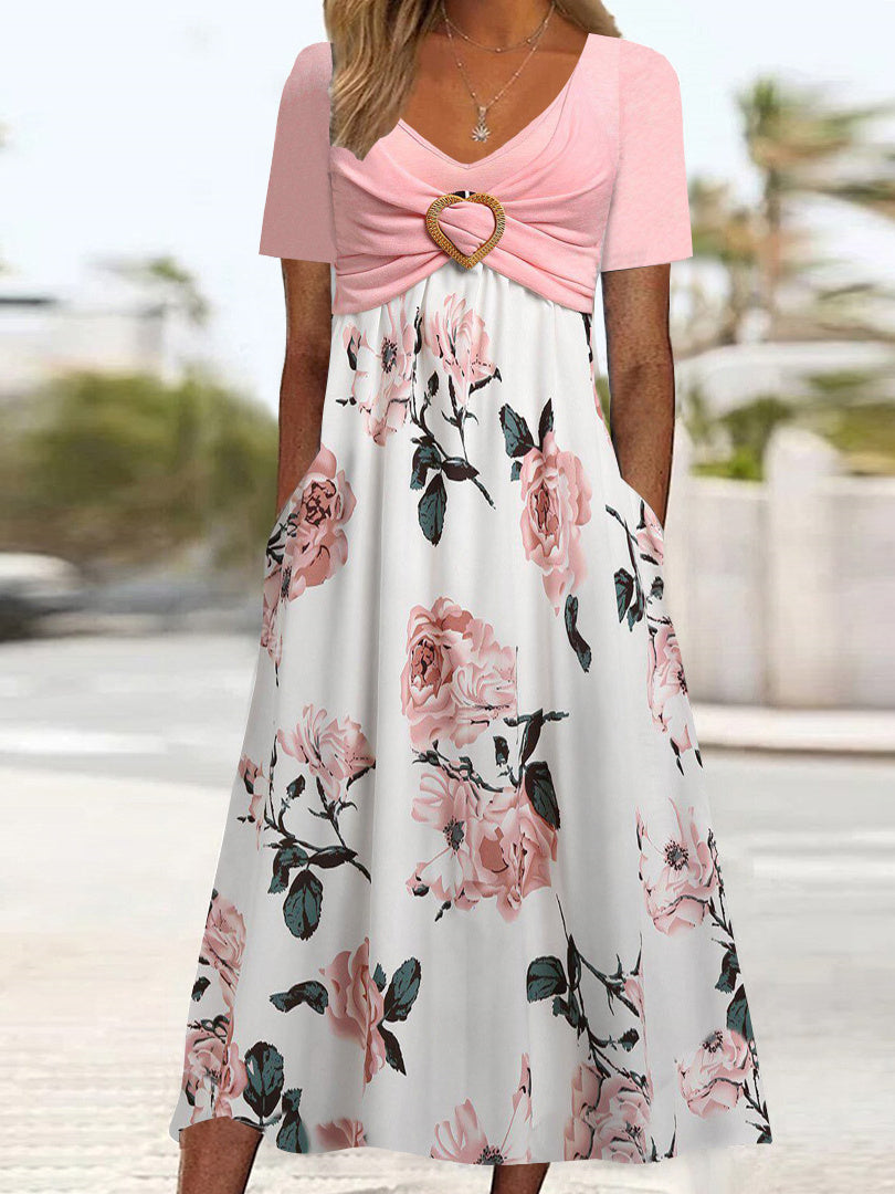 Women's Half Sleeve V-neck Floral Printed Design Midi Dress