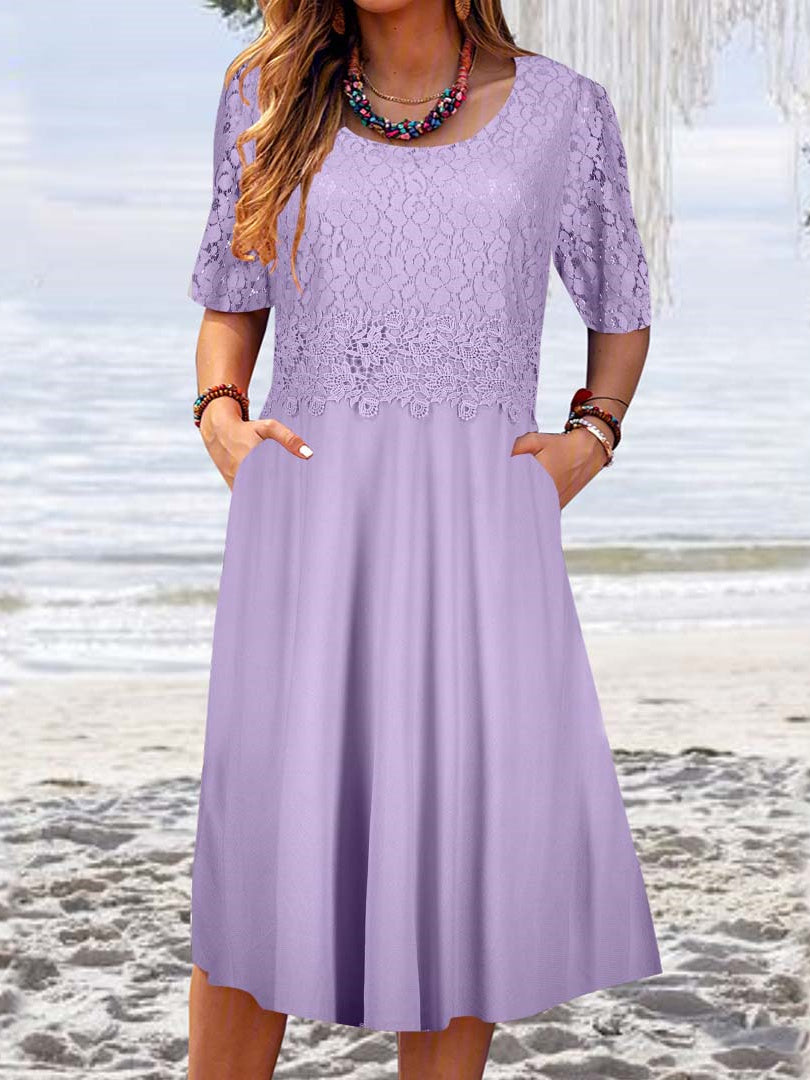 Women's Short Sleeve Scoop Neck Solid Lace Pockets Midi Dress