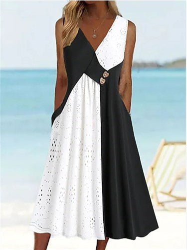 Women Sleeveless V-neck Hollow Colorblock Dress