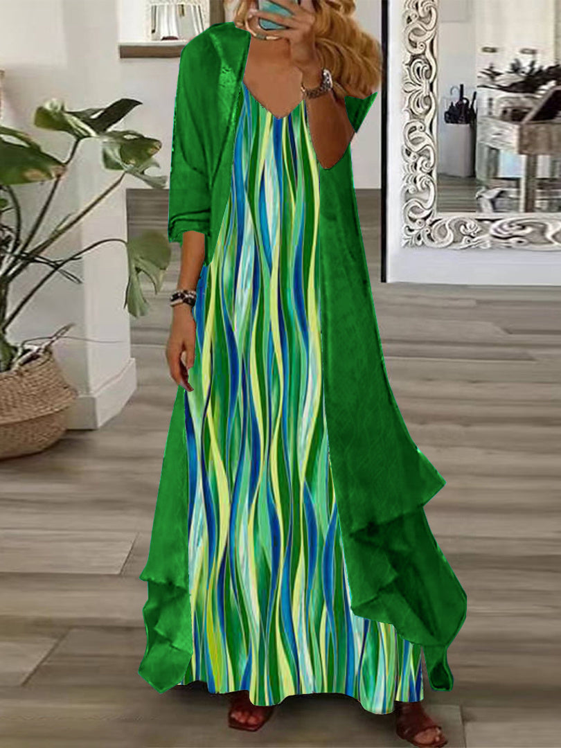 Women's Long Sleeve V-neck Graphic Printed Two Pieces Maxi Dress