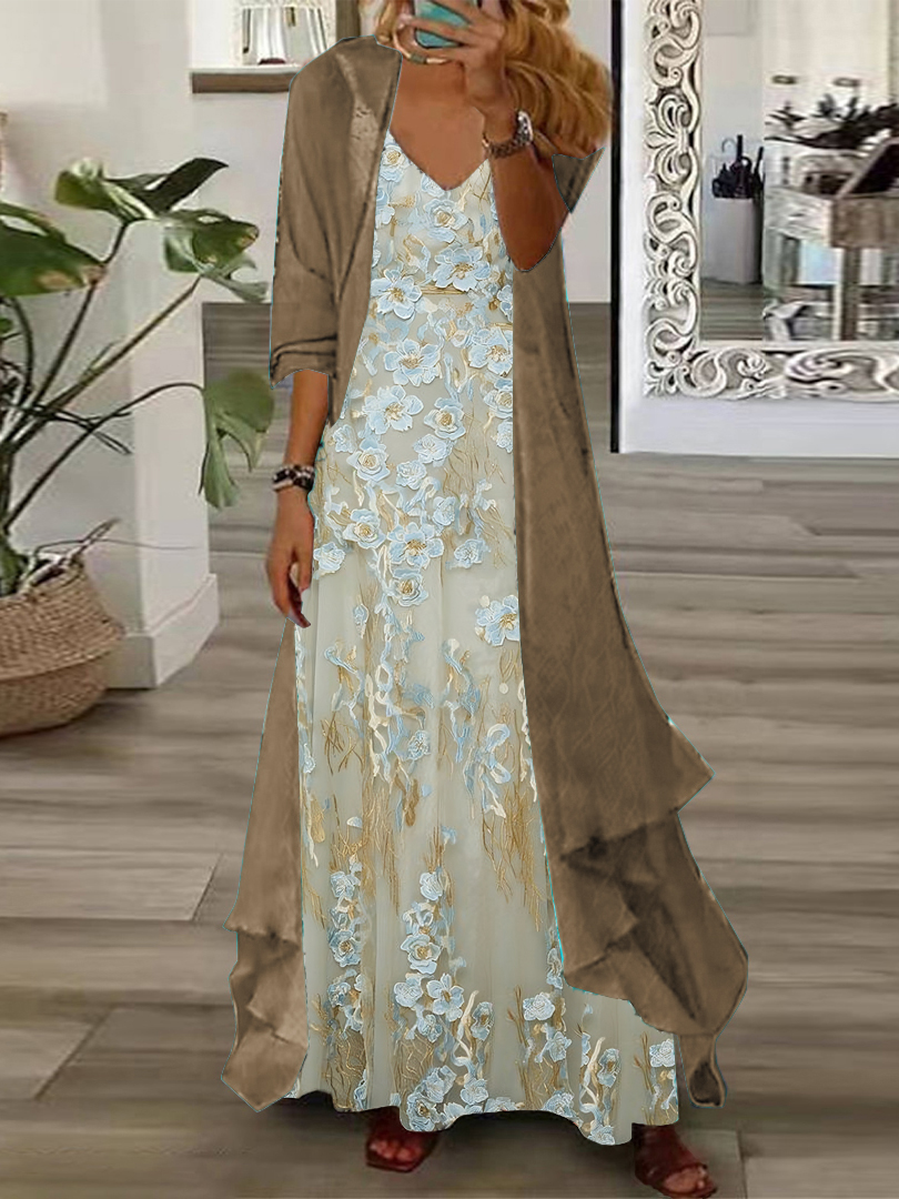 Women's Long Sleeve V-neck Floral Printed Two Pieces Maxi Dress