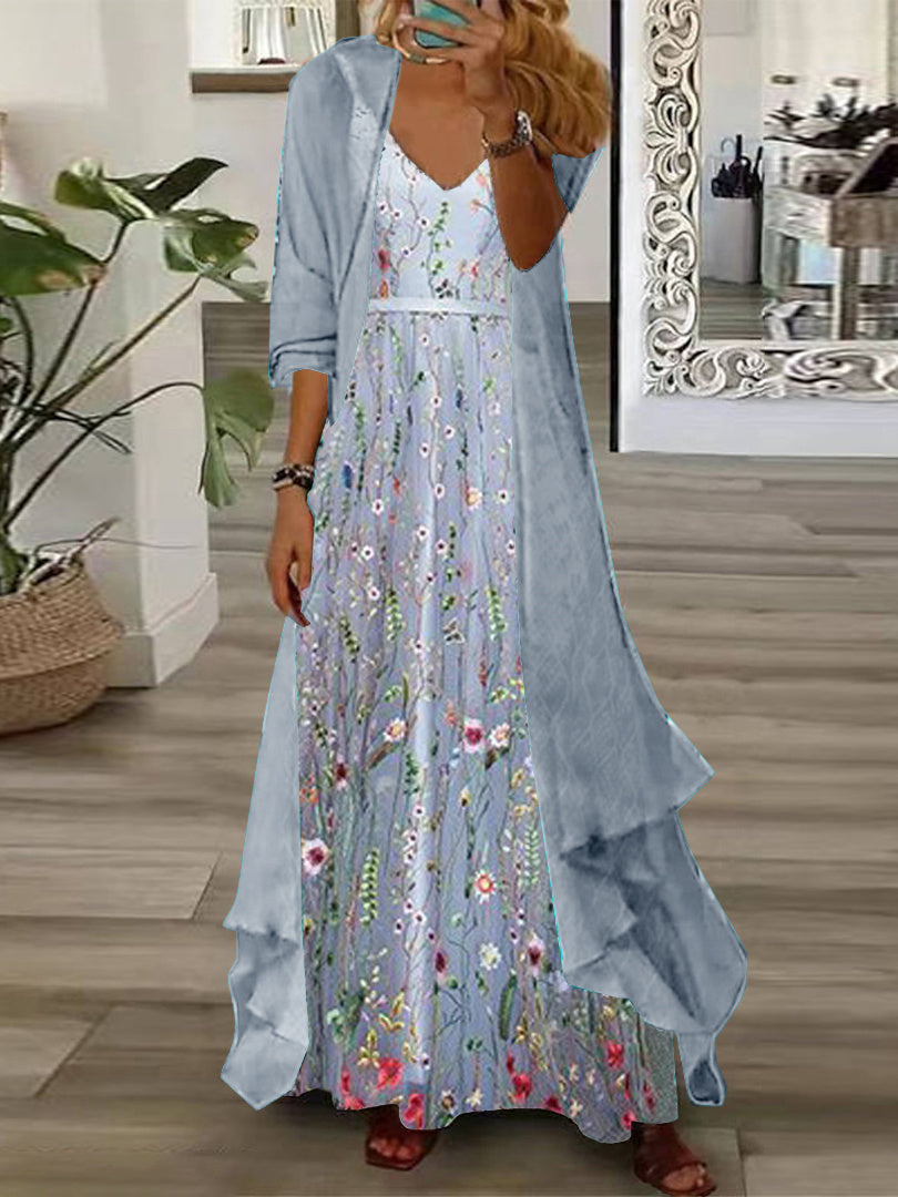 Women's Long Sleeve V-neck Floral Printed Two Pieces Maxi Dress