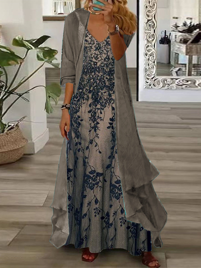 Women's Long Sleeve V-neck Floral Printed Two Pieces Maxi Dress