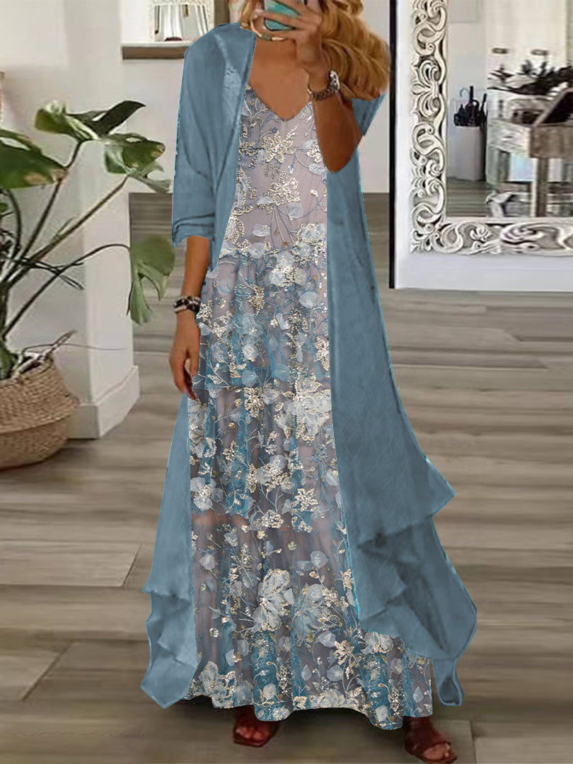 Women's Long Sleeve V-neck Floral Printed Two Pieces Maxi Dress