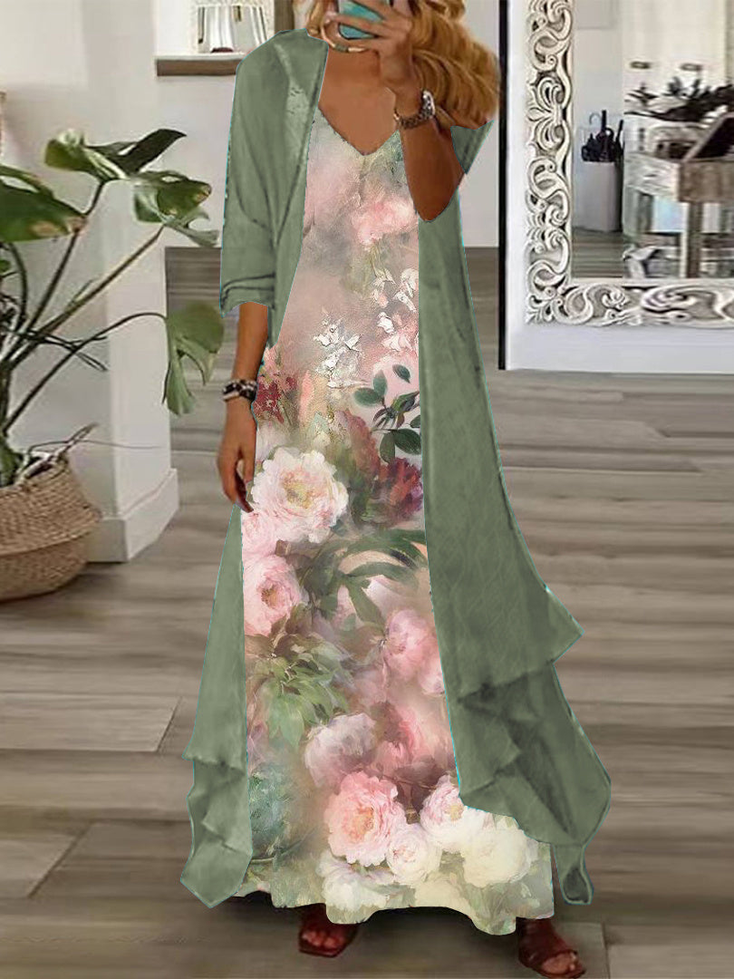 Women's Long Sleeve V-neck Floral Printed Two Pieces Maxi Dress