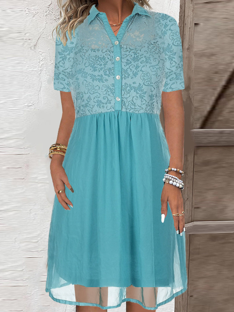 Women's Short Sleeve V-neck Floral Printed Lace Stitching Midi Dress
