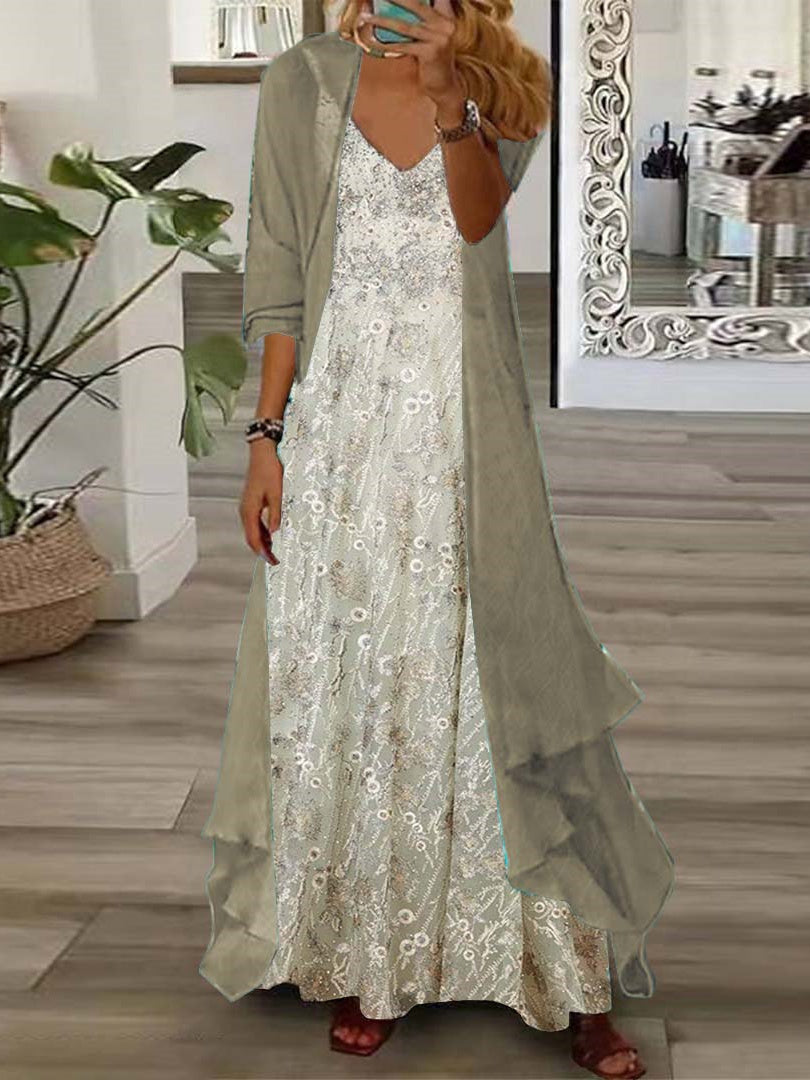 Women's Long Sleeve V-neck Graphic Printed Two Pieces Maxi Dress