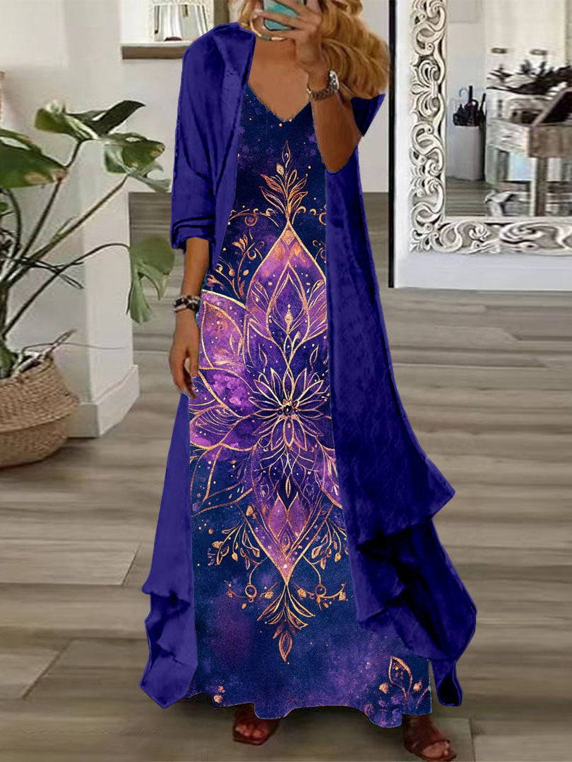 Women's Long Sleeve V-neck Graphic Printed Two Pieces Maxi Dress