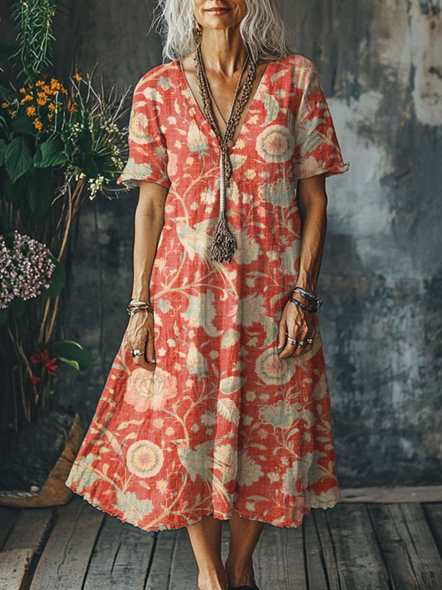 Women's Floral Art Print Pocket Cotton Dress