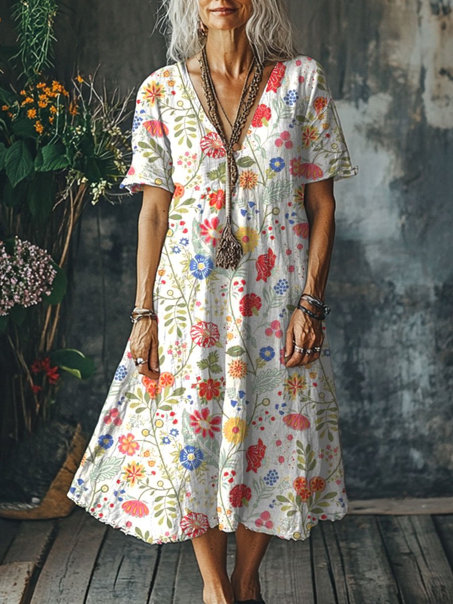 Women's Flowers Art Print Pocket Cotton Dress