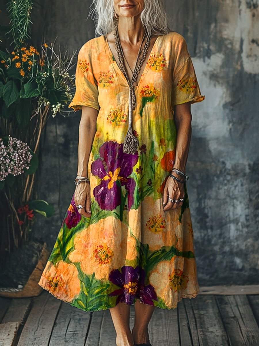Women's Flowers Art Print Pocket Cotton Dress
