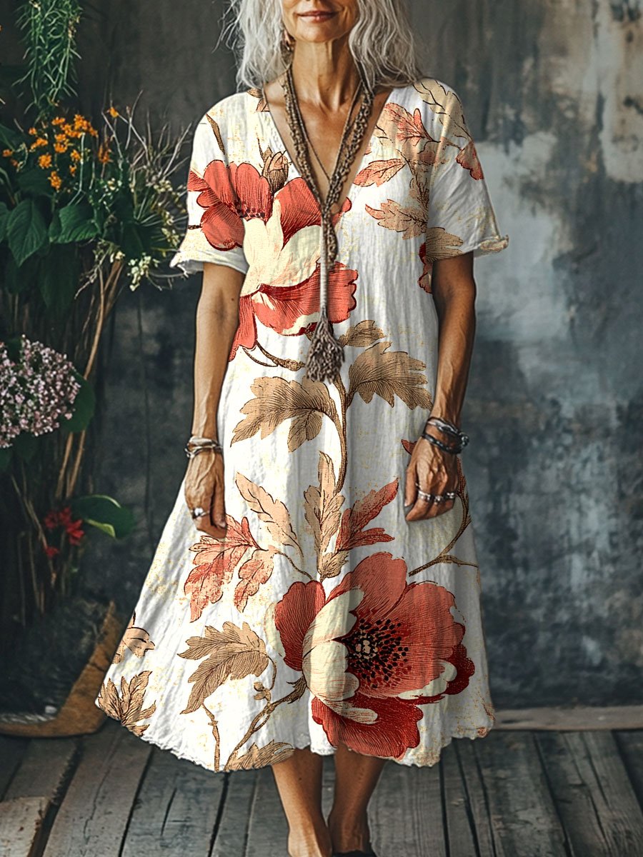 Women's Flowers Art Print Pocket Cotton Dress