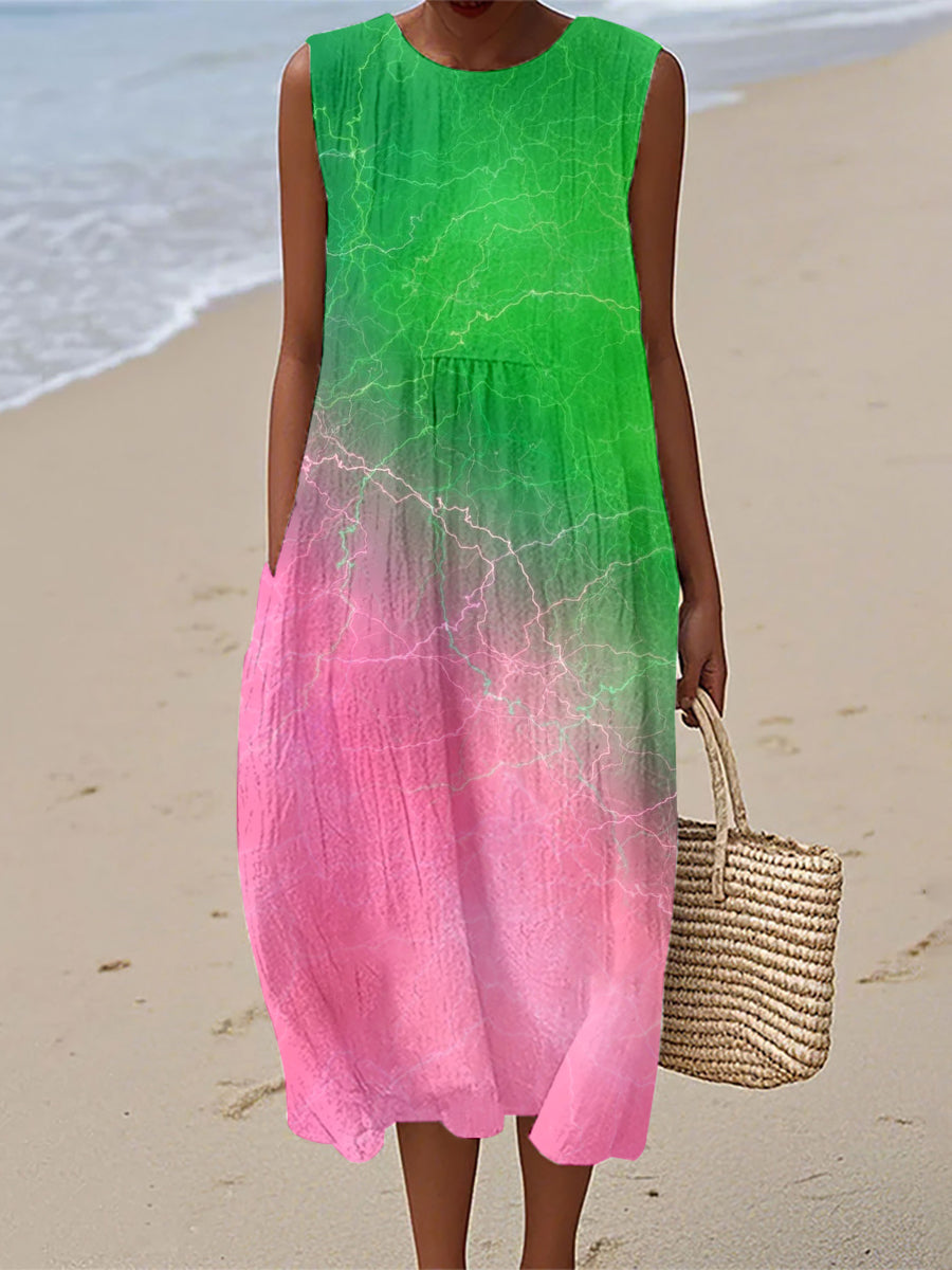 Womens Green and Pink Contrast Color Inspired Linen Dress