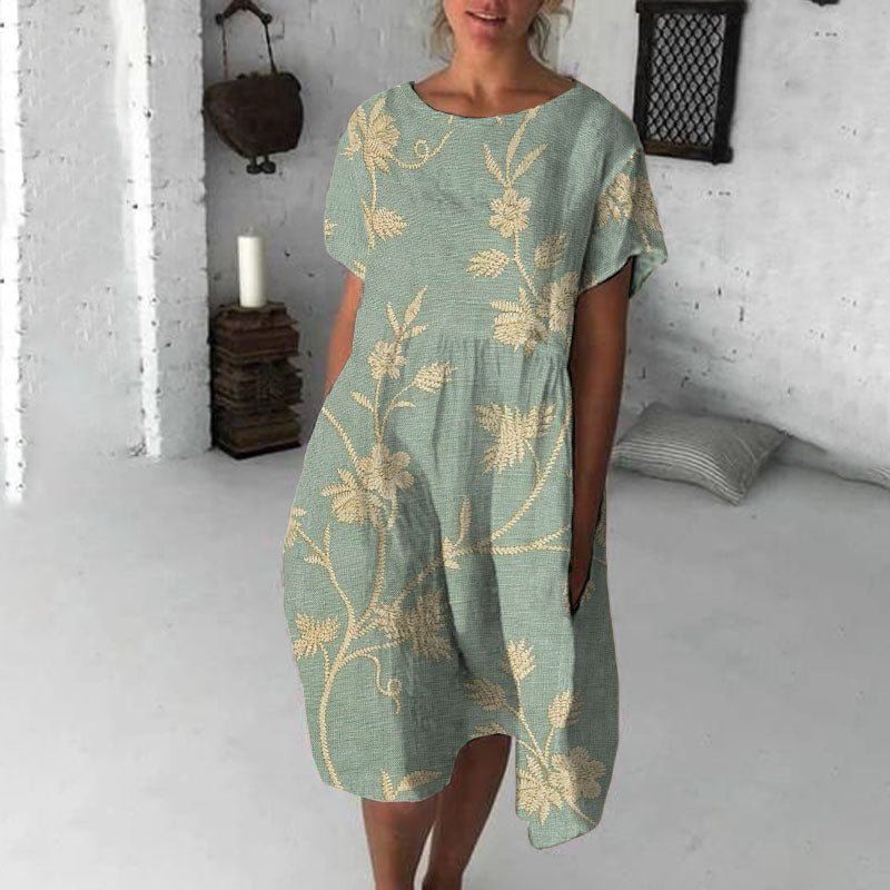 Women'S Retro Floral Print Cotton Linen Round Neck Midi Dress