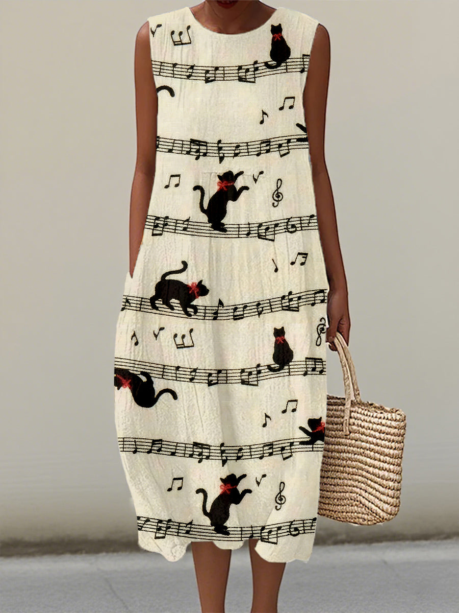 Women's Vintage Cat and Music Notes Print Linen Dress
