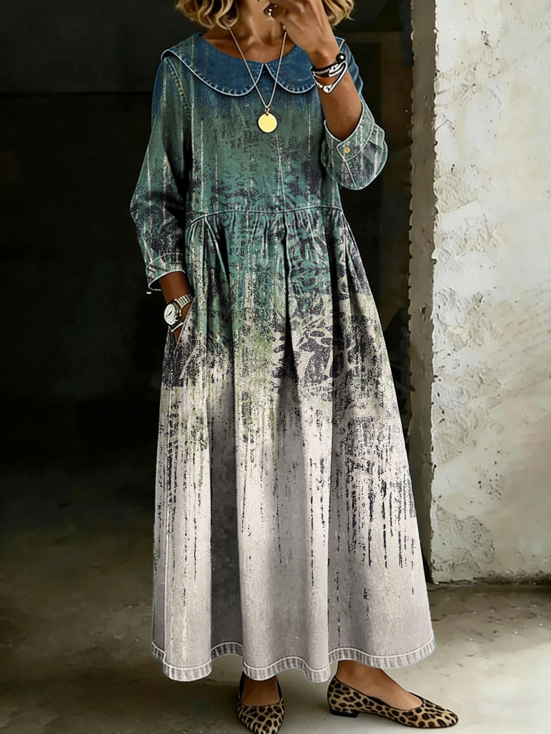 Women's Vintage Ethinic Peter Pan Collar Long-sleeved Casual Loose Dress