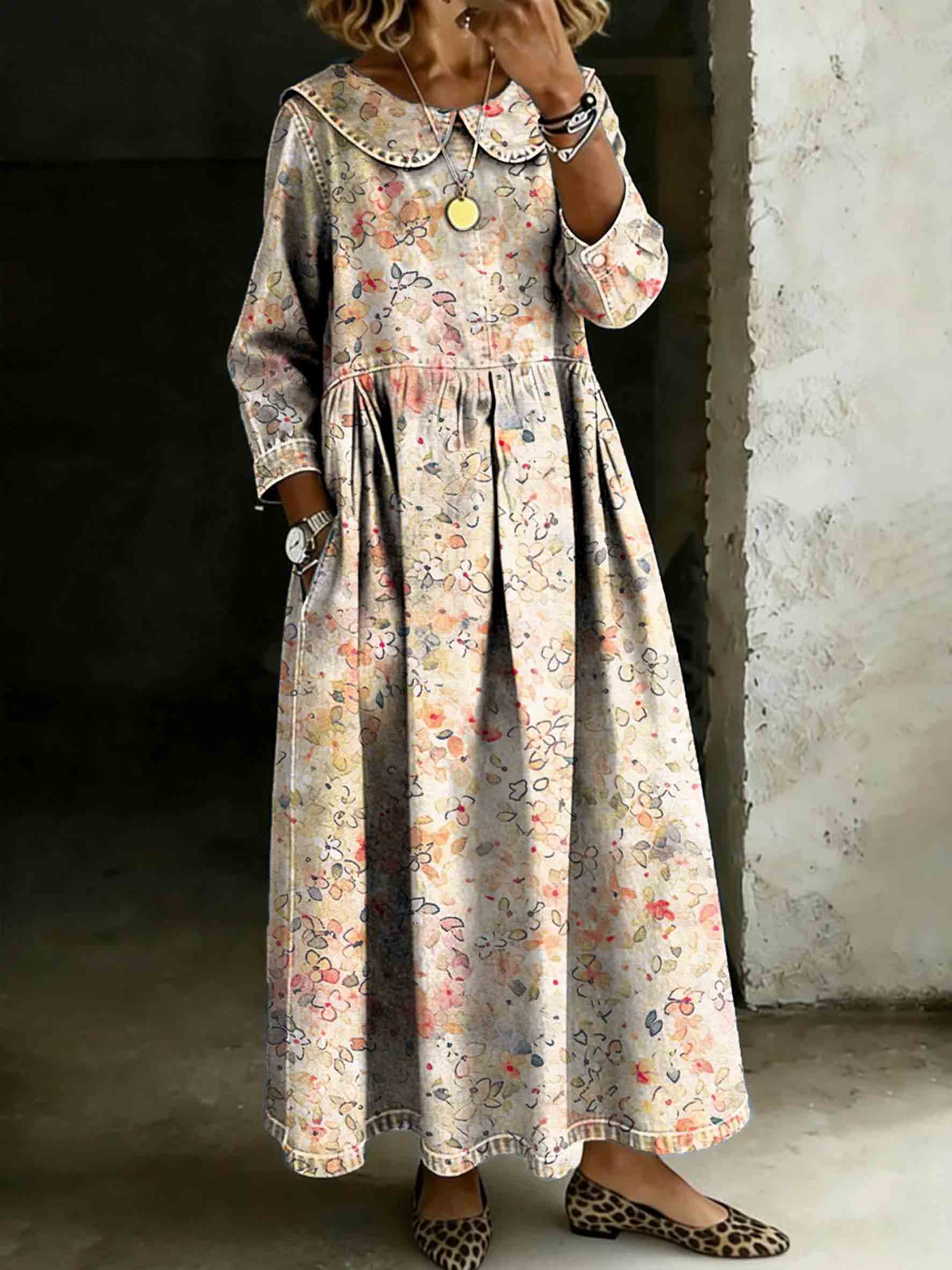 Women's Vintage Floral Print Lapel Collar Pleated Long Sleeve Casual Loose Dress