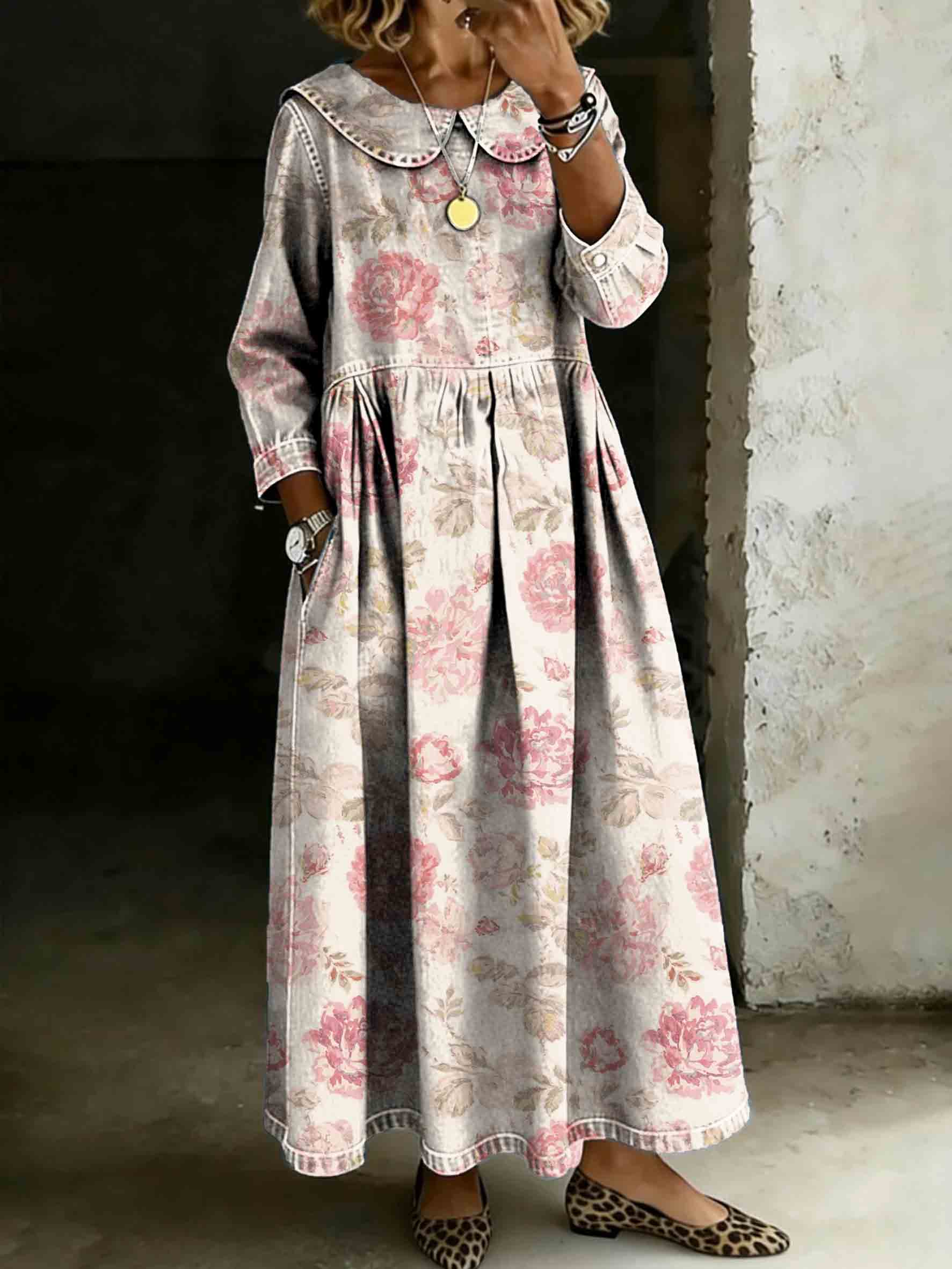 Women's Vintage Floral Rose Art Print Lapel Collar Pleated Long Sleeve Casual Loose Dress