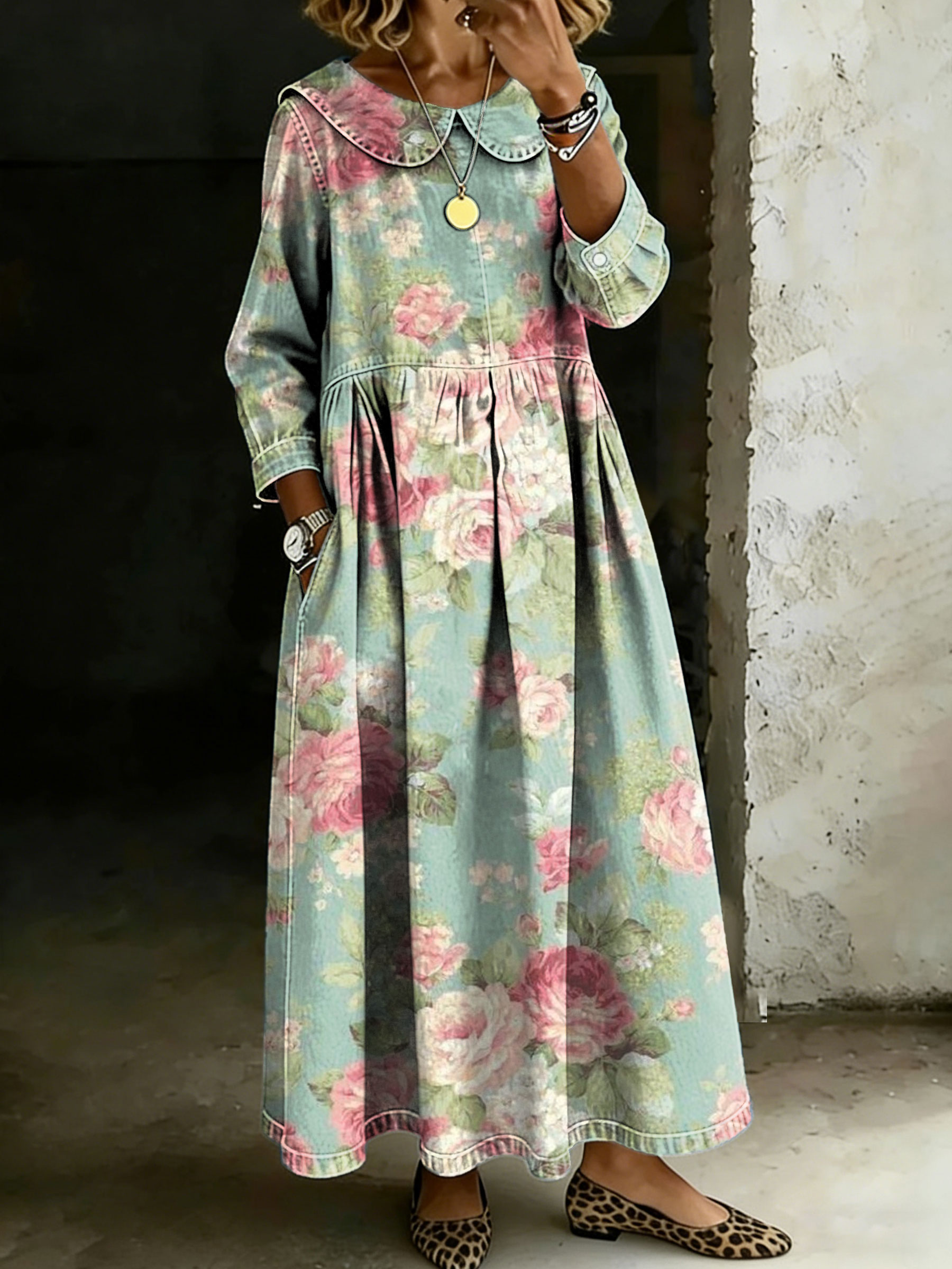 Women's Vintage Flower Peter Pan Collar Long-sleeved Casual Loose Dress
