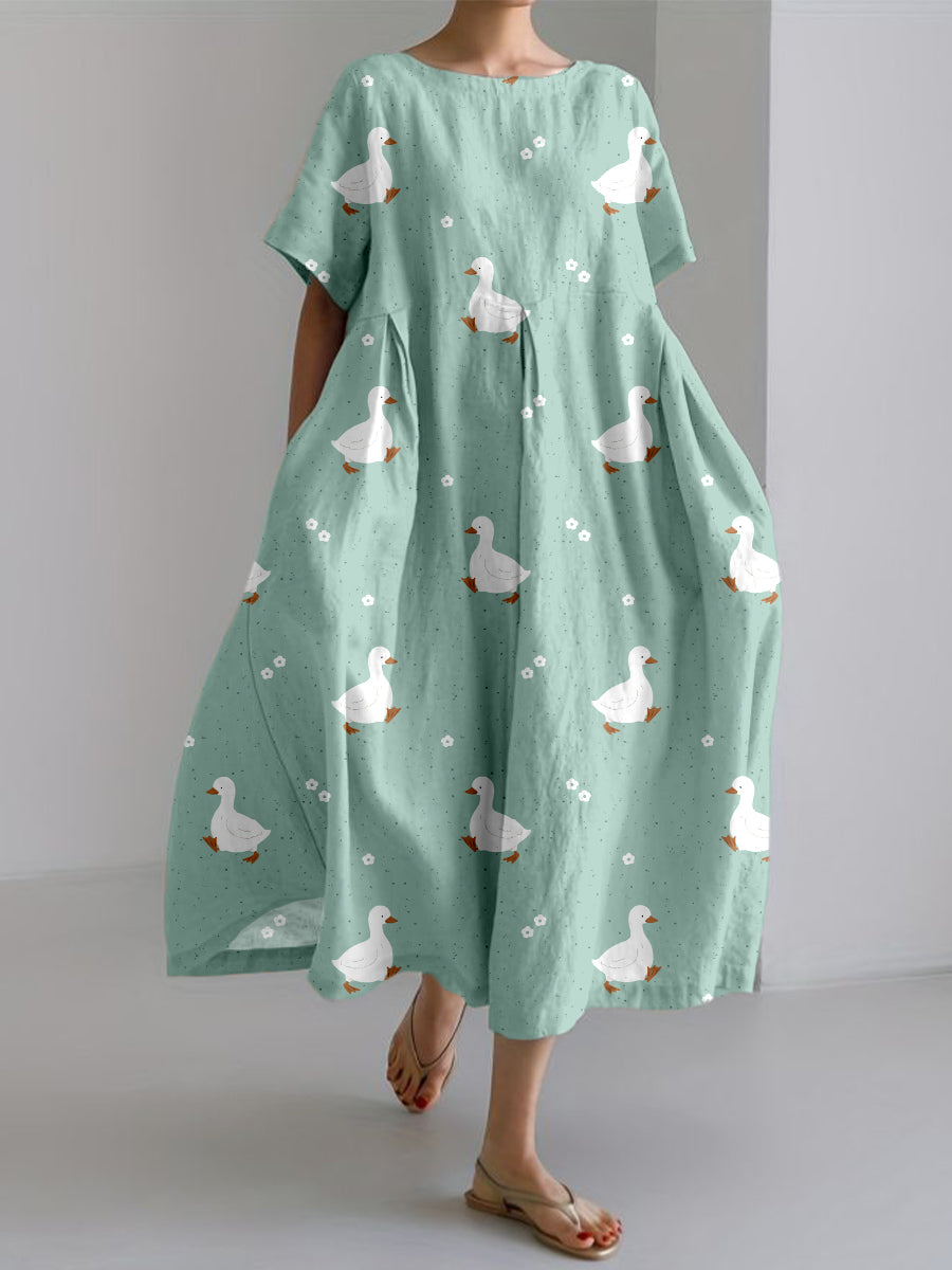 Women's White Duck Print Linen Short Sleeve Dress
